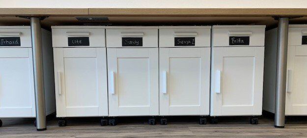 Geklaut bei Google: Weil viele unserer Mitarbeitenden oftmals an Außenstandorten unterwegs sind, haben wir ein Desk Sharing Prinzip im Büro eingeführt. Hierfür hat nun jeder Mitarbeitende ohne festen Arbeitsplatz einen eigenen Rollcontainer, in dem er seine persönlichen Gegenstände lagern kann. Natürlich in der Vollausstattung inklusive Locher, Tacker, Tesa, Stift, Laptop etc.!